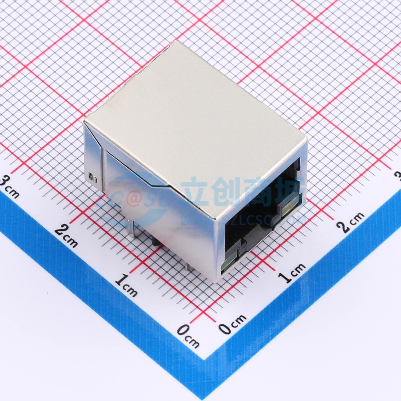 - 网口插座 千兆网口 RJ45-10P/10C TAB-Down H=21.1 带灯左绿右黄 无弹 带变压器 十字脚
