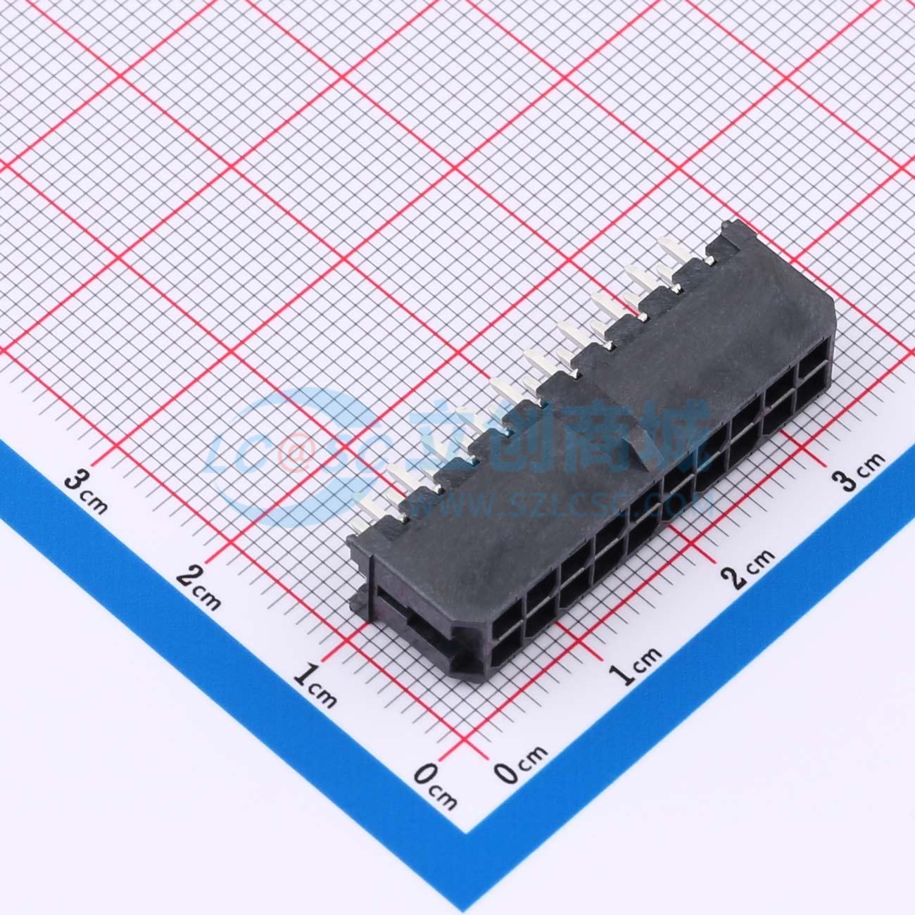 - Micro-Fit 3.0垂直公座,间距3.00mm,双排,20路,带PCB定位销,镀金,符合灼热丝测试要求,黑色