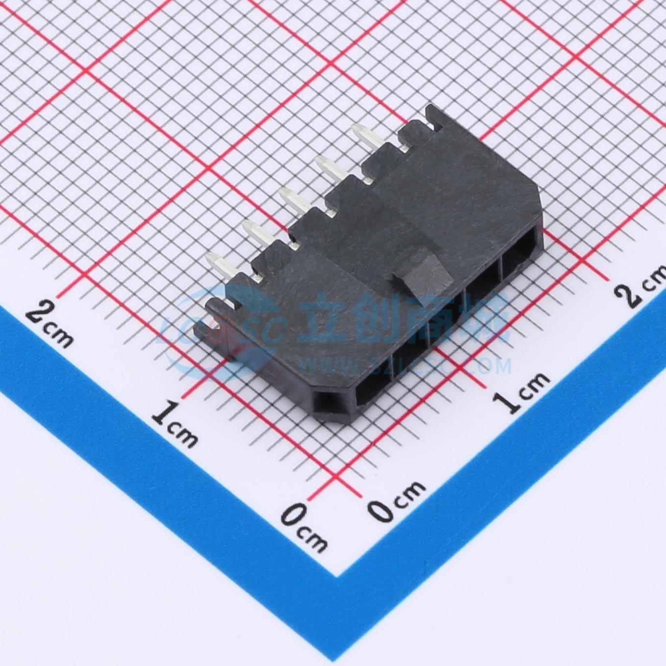 - Micro-Fit 3.0垂直公头,间距3.00mm,单排,5路电路,带PCB定位销,镀金,符合灼热丝测试要求,黑色