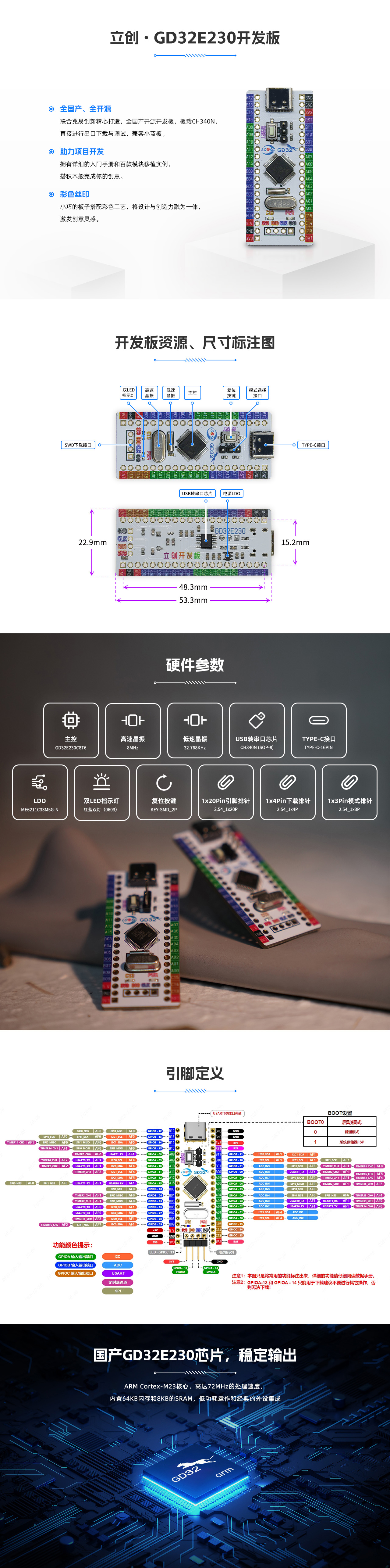 - 全国产开源开发板,可直接进行串口下载与调试,兼容小蓝板。拥有详细的入门手册和百款模块移植实例。小巧的板子搭配彩色工艺,将设计与创造力融为一体,激发创意灵感。采用ARM Cortex M23核心,高达72MHz的处理速度,内置64KB闪存和8KB的SRAM,低功耗运作和经典的外设集成。