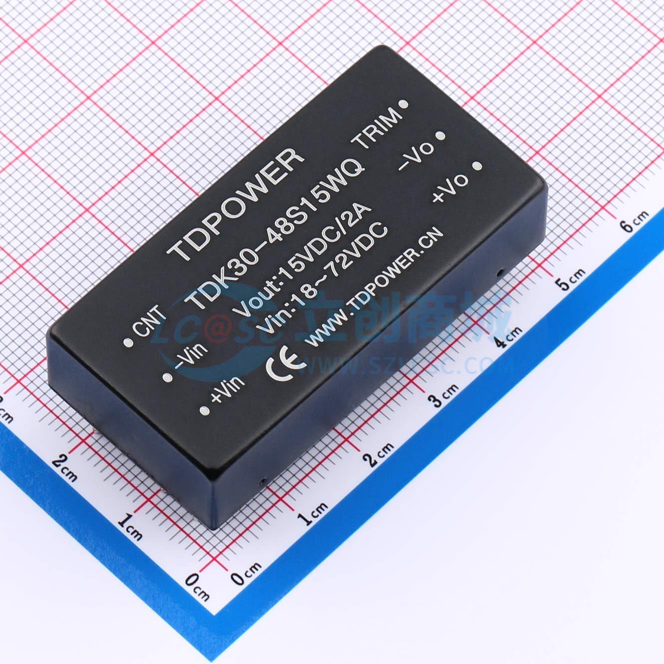 - 3000V隔离,输入范围DC18~72V/4:1,输出15V,30W,隔离电压大于3000VDC,2*1英寸国际标准,工业级,TDK30系列模块电源效率高达90%,兼容TURB4815LD-30WR3Q,DIP:50.8*25.4*12mm