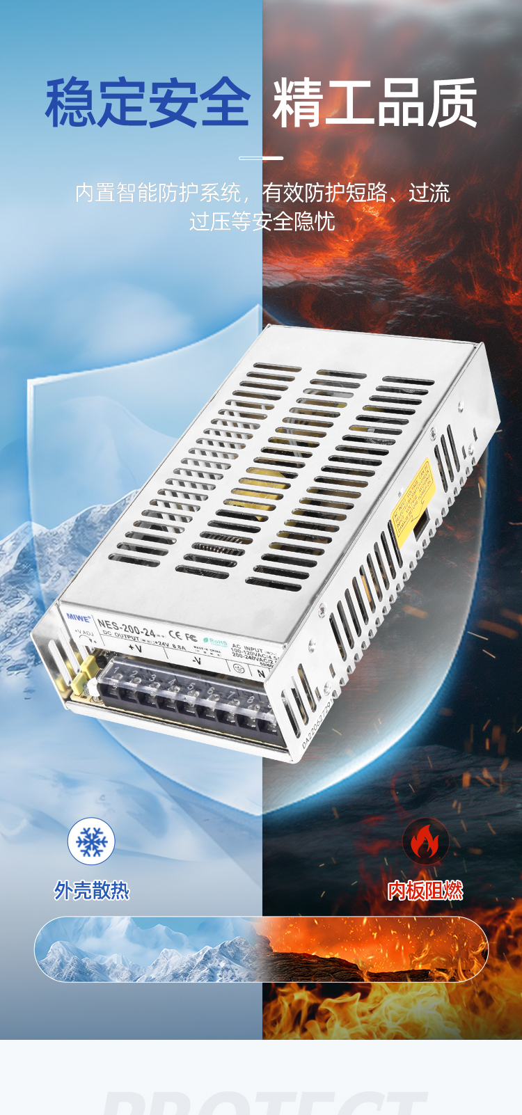 3多重保护:内置过载、过压、短路和过温保护功能,有效保障电源及负载的安全。