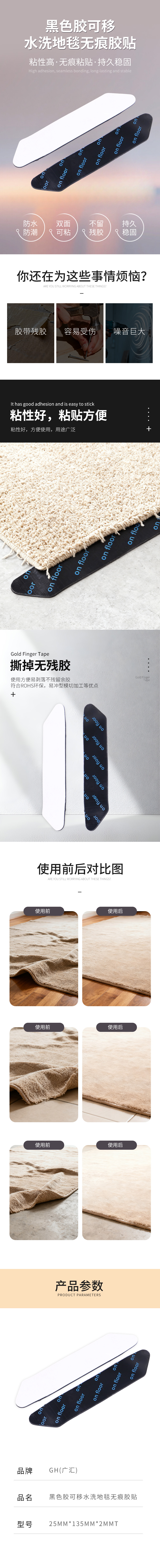 黑色胶可移水洗地毯无痕胶贴