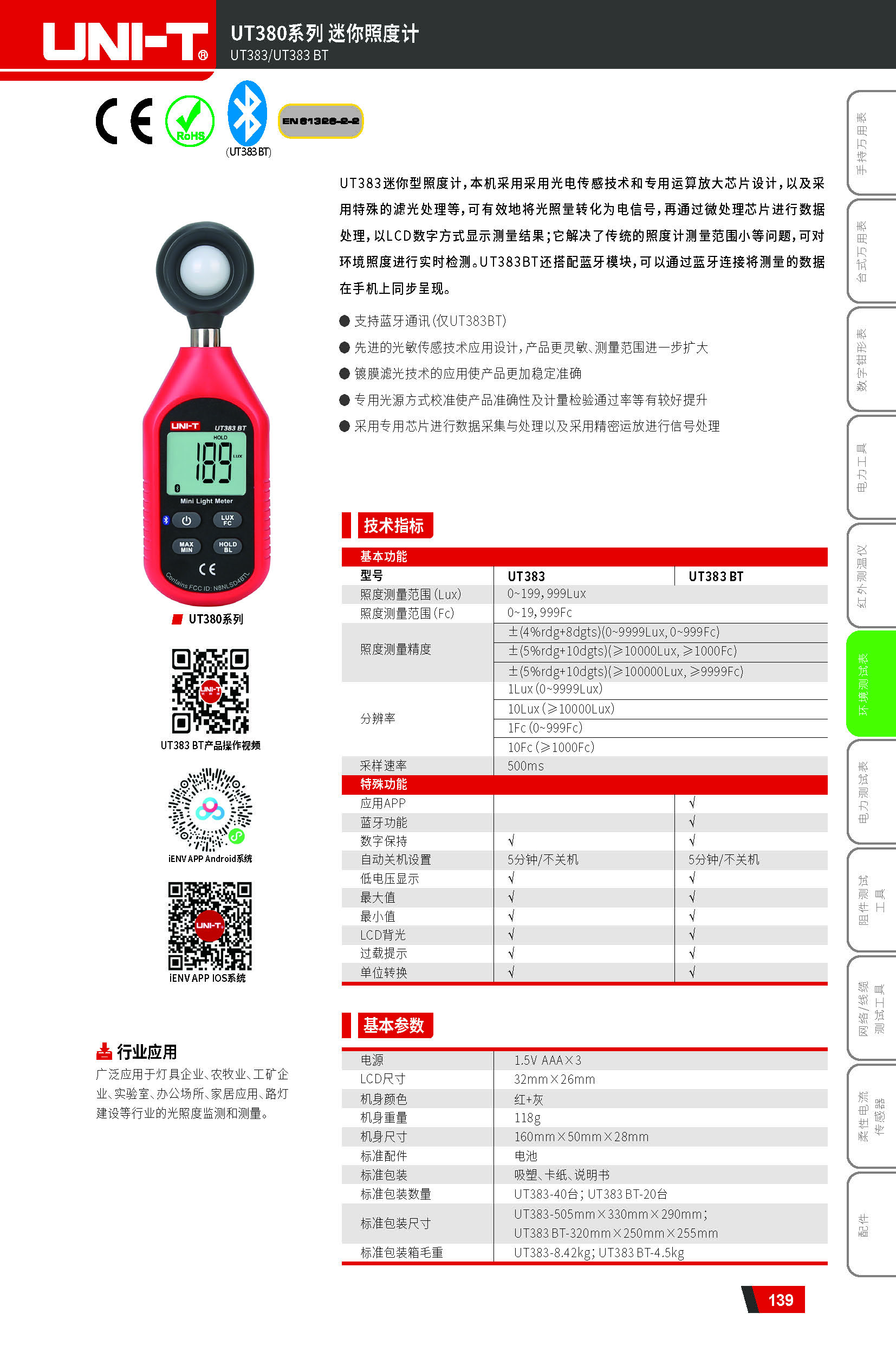 支持蓝牙通讯(UT383BT型号),可通过蓝牙连接将测量数据同步至手机APP实时呈现