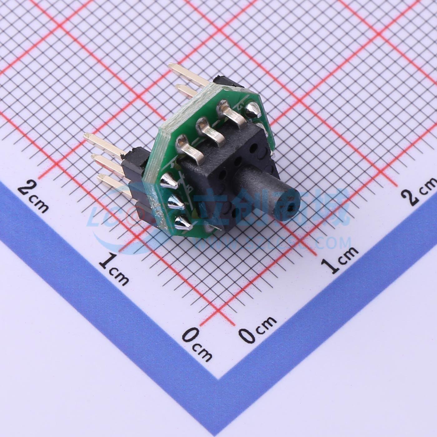 - GZP6847A型压力传感器采用类DIP封装形式,PCB板的2面分别安装有SOP封装的压力传感器芯片与信号处理电路芯片,对传感器的偏移、灵敏度、温漂和非线性进行数字补偿,以供电电压为参考,产生一个经过校准、温度补偿后的标准电压信号。