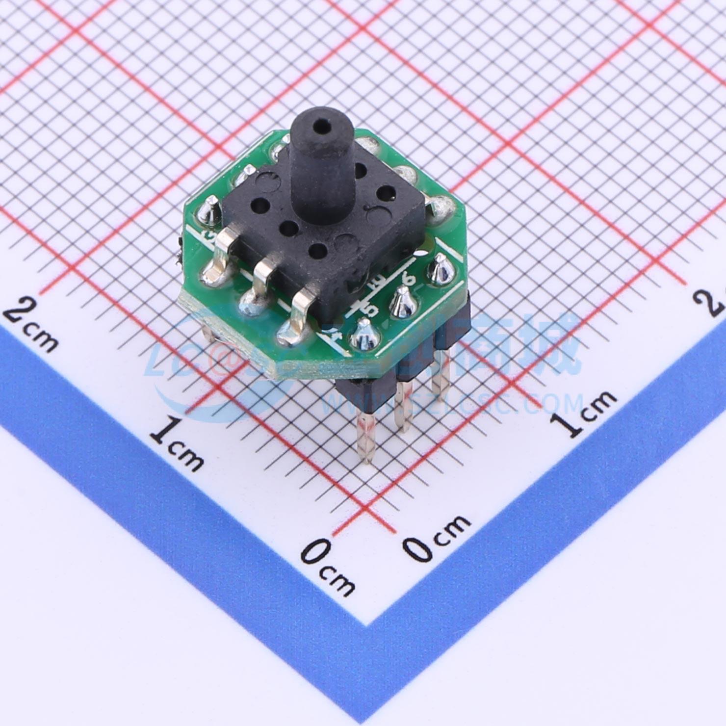 - GZP6847A型压力传感器采用类DIP封装形式,PCB板的2面分别安装有SOP封装的压力传感器芯片与信号处理电路芯片,对传感器的偏移、灵敏度、温漂和非线性进行数字补偿,以供电电压为参考,产生一个经过校准、温度补偿后的标准电压信号。
