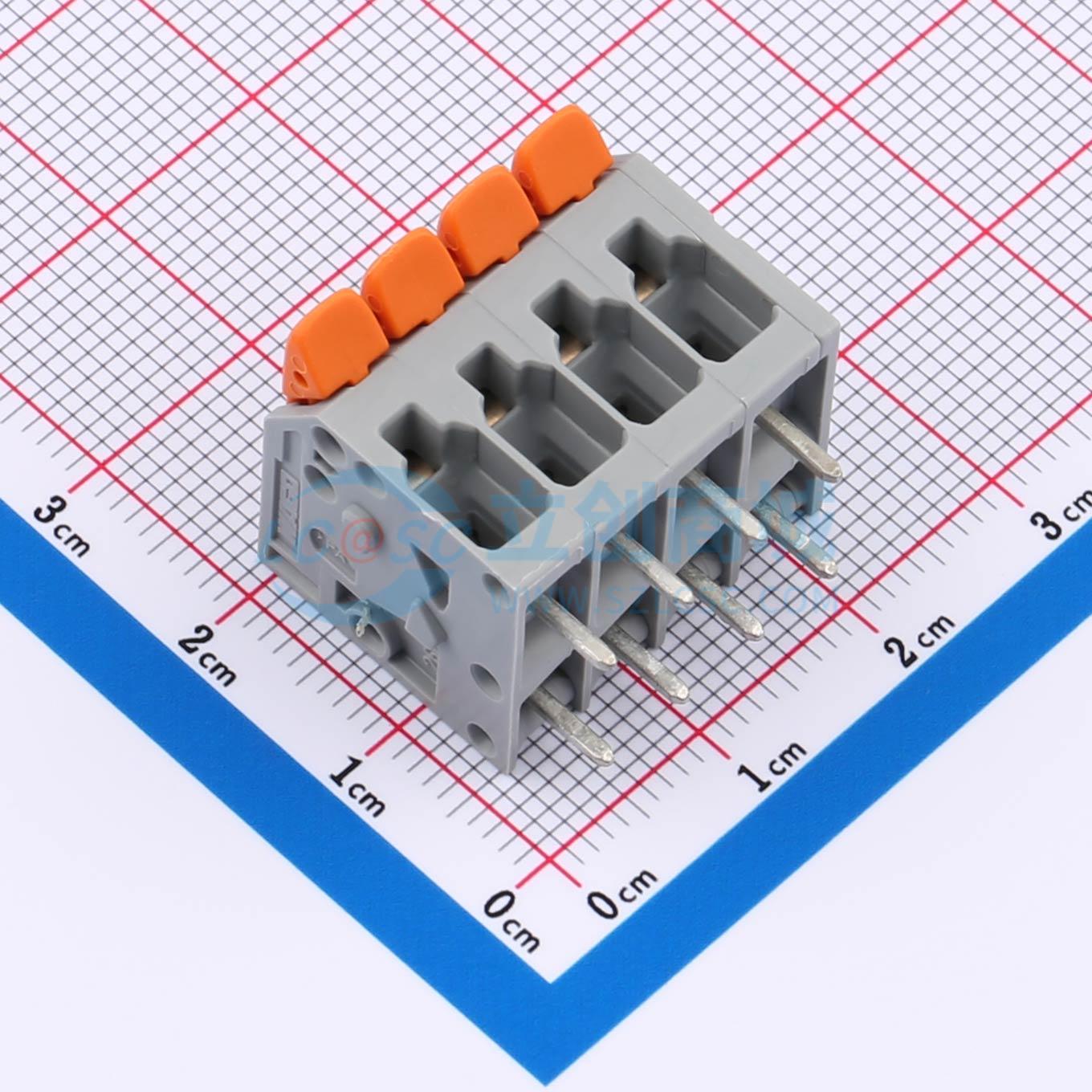 - PCB 接线端子; 操作手柄; 4 mm2; 焊针间距 5 mm; 4极; 推入式笼夹; 4,00 mm2; 灰色