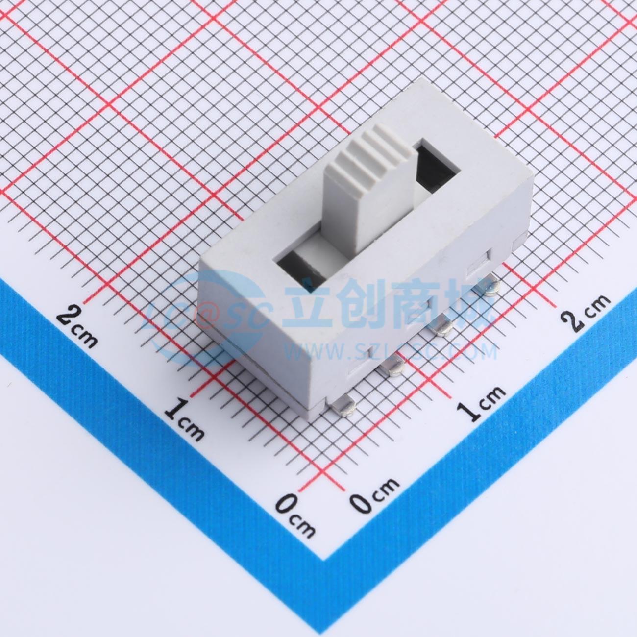 - 拨动开关,立式弯脚贴片双排三档,20.8x10.5x8.5弧形白柄,白色主体,柄长7mm
