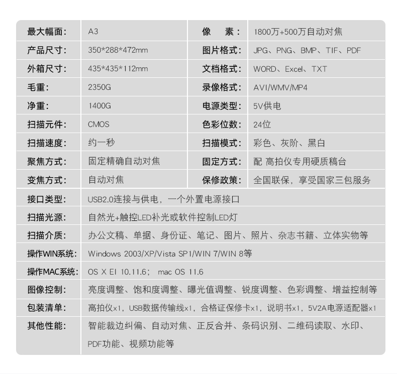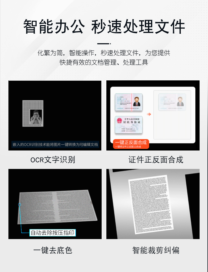 智能功能:支持彩色/灰阶/黑白扫描模式,具备OCR文字识别(可转换为Word/Excel/PDF/TXT等格式)、证件正反面合成、自动裁剪纠偏、一键去底色、曲面展平、去除噪点等功能