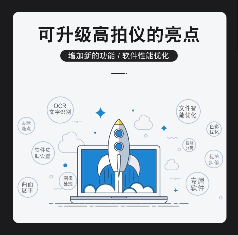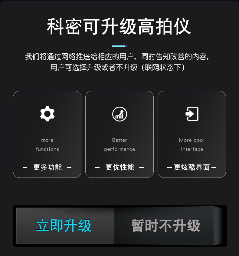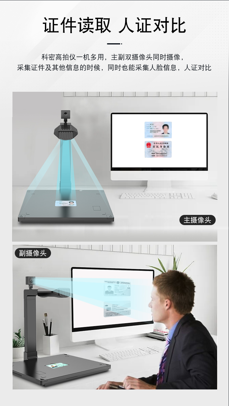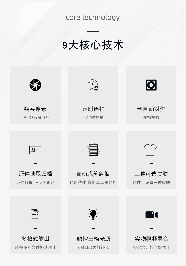 附加能力:支持实时录像、高清投影(适用于教学/培训)、1秒定时连拍、人证对比、软件皮肤设置及在线升级(增加功能/优化性能)