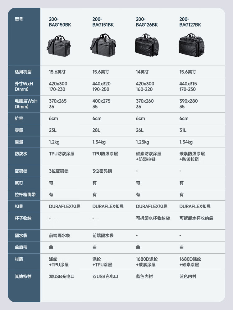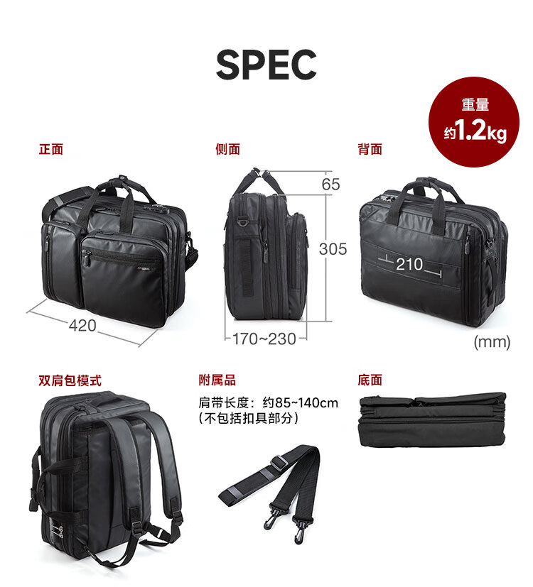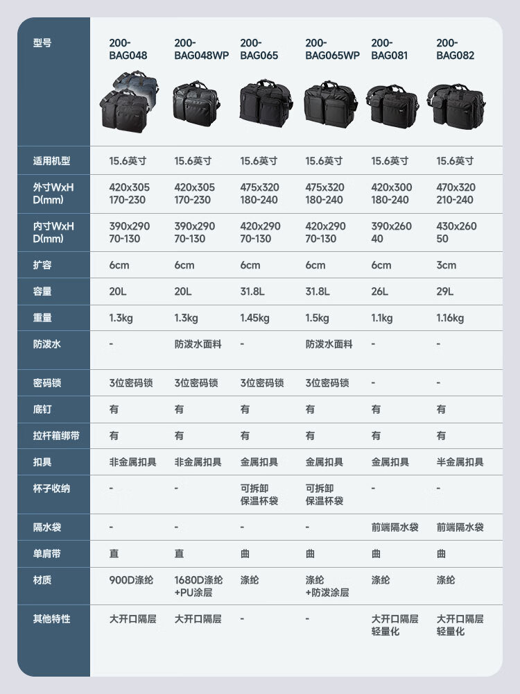 SANWA SUPPLY 200-BAG048WP 经典3WAY电脑包采用1680D涤纶面料搭配PU防泼水涂层,具备出色的防泼水和防污性能,可有效抵御突发降雨,表面水珠一擦即净,保持包体整洁。该包支持手提、斜挎、双肩背三种背负方式,满足不同使用场景需求,背带可收纳至底部口袋,切换模式便捷。主收纳层设有6cm可扩展设计,容量可灵活调节,最大可达20L,适合1~2晚短途差旅使用。内部采用双隔层大空间设计,包含独立的电脑收纳区(适用于15.6英寸笔记本)和文件收纳袋,实现商务与私物分类存放,提升整理效率。前翻式大开口设计便于快速取放物品,一目了然。前端配备多个功能口袋:左侧杂物袋可放置保温杯或折叠伞,右侧可装手机或圆珠笔,竖立式口袋适合钱包、车票等频繁取用物品,横卧式口袋用于手账、纸巾等较大物件,另设两个小物口袋及专用手机收纳袋,充分满足日常出行收纳需求。电脑层附带3位密码锁,保障电子设备安全,出厂默认密码为【000】,用户可自行设置新密码。包体背面设有拉杆箱固定带,宽度达21cm,可稳固挂靠于行李箱上,解放双手,方便移动。所有扣具均采用坚固耐用材质,经久耐磨,确保长期使用稳定性。整体重量约1.2kg,轻便易携,适合职场人士通勤与商务差旅双重用途。