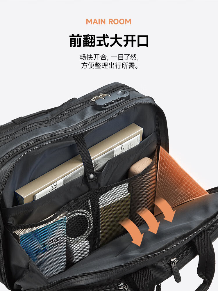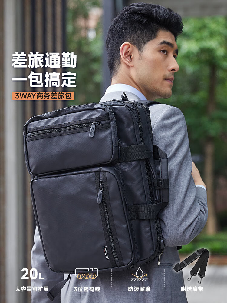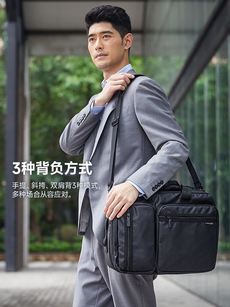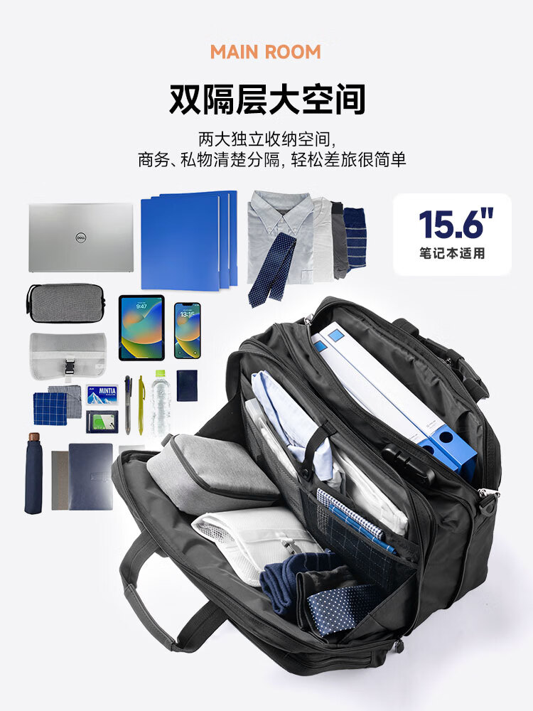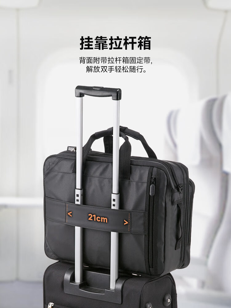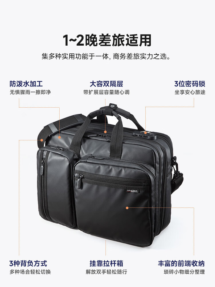 本款电脑包专为商务人士设计,适用于日常通勤、短期出差、会议携带、机场登机等多种场景。其3WAY背负方式使其在办公室、地铁、机场、酒店之间轻松转换使用模式:手提模式适合正式场合出入办公场所;斜挎模式便于行走时解放双手;双肩背模式则更适合长时间携带,减轻单肩压力。由于具备防泼水功能,特别适合雨天城市出行,无需担心雨水侵袭。可挂靠拉杆箱的设计非常适合中短途旅行,将电脑包固定于行李箱上,实现一站式出行,避免携带多件行李的麻烦。内部双隔层结构可清晰划分工作资料与个人物品,适合需要携带笔记本电脑、文件夹、衣物、充电宝、水杯、手机等各类物品的商务人士。其尺寸符合托运行李标准,可作为登机随身包使用,尤其适合1~2晚的差旅行程,兼顾实用性与专业形象。