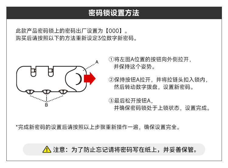 1 请在首次使用前按照说明书正确设置密码锁,出厂默认密码为【000】,建议设置个人专属密码并记录保存,防止遗忘。