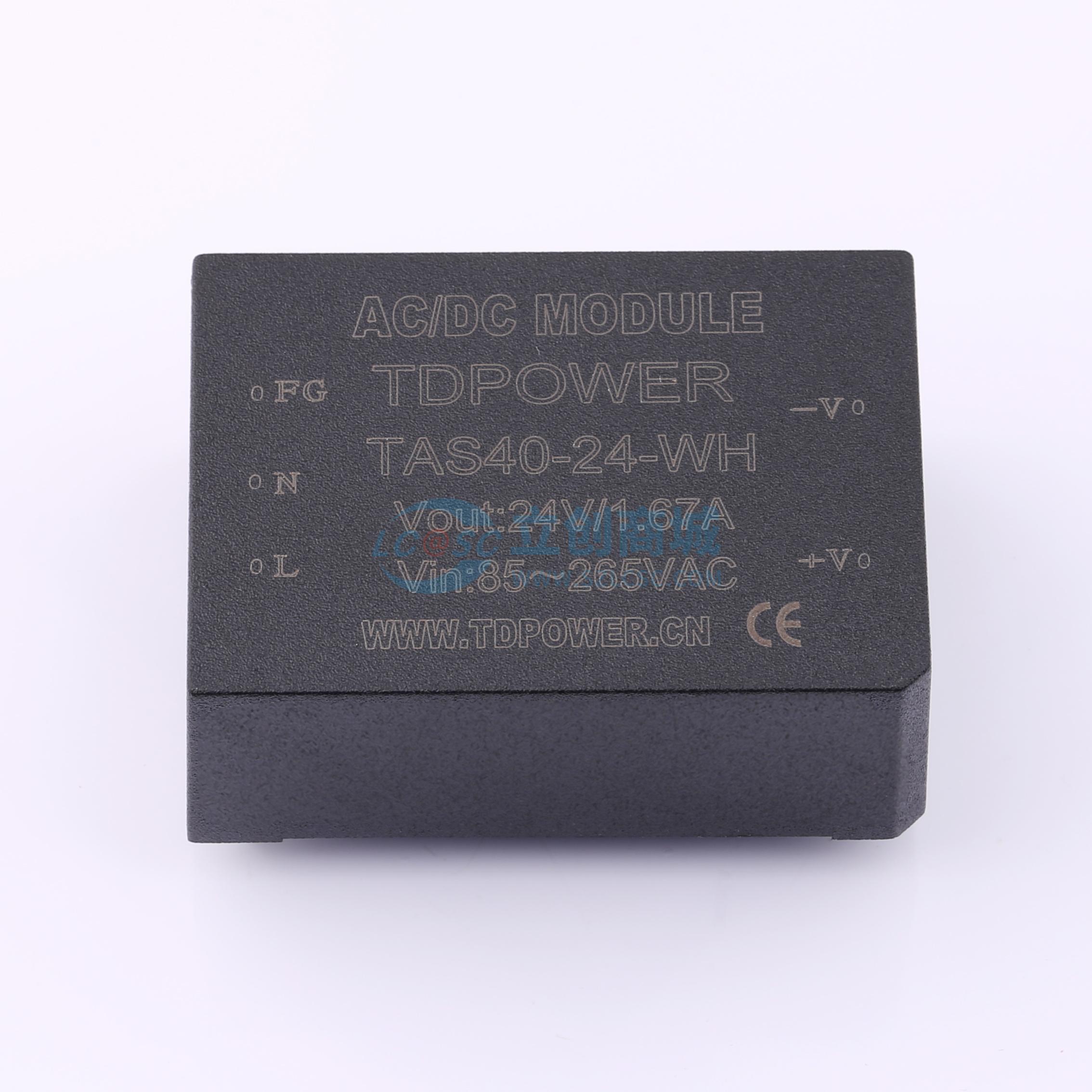 - AC85~265V/DC100~370V输入,输出24V,40W,隔离电压大于2.5kVAC,标准尺寸,工业级,待机功耗低至0.2W,与TLH40-23B24R2H完全兼容,TAS40H系列模块电源效率高达89%,DIP:62*45*22mm