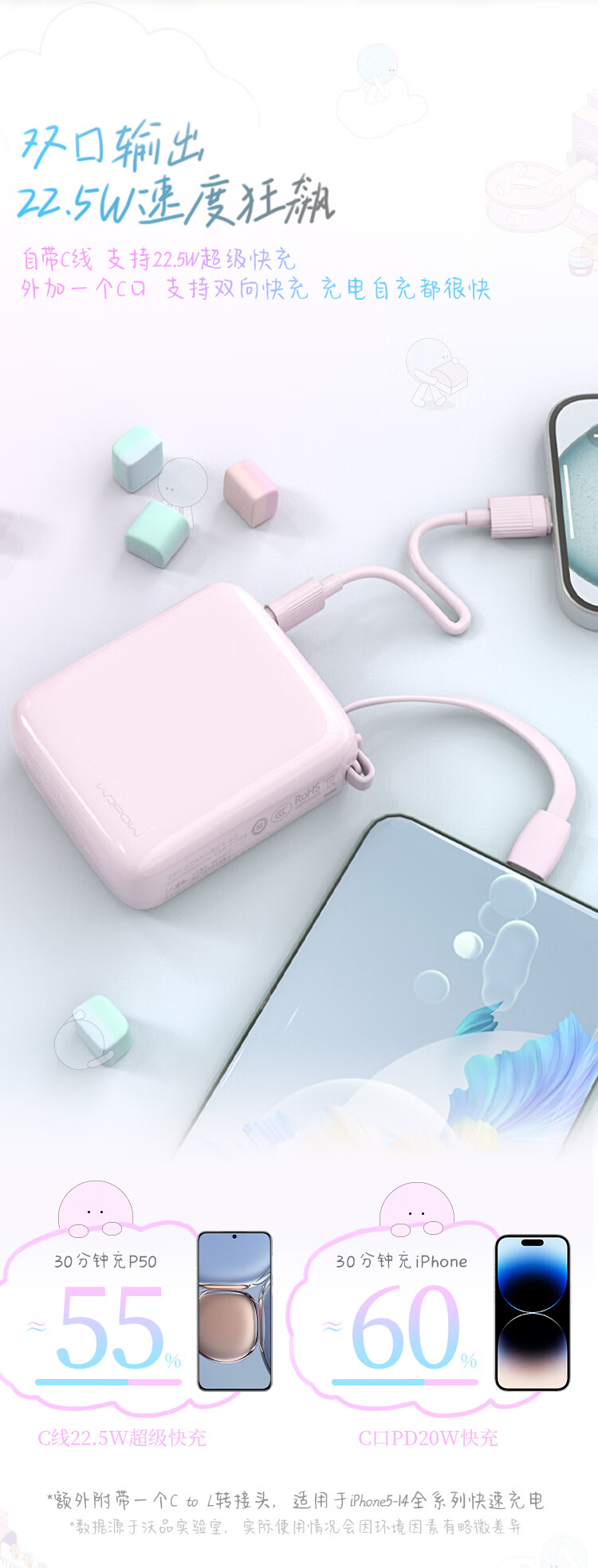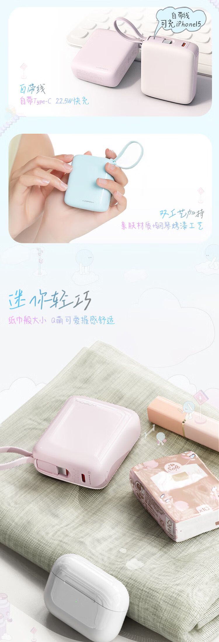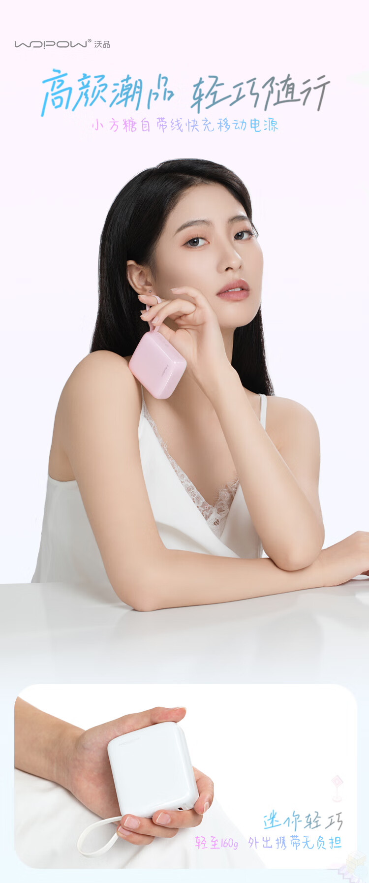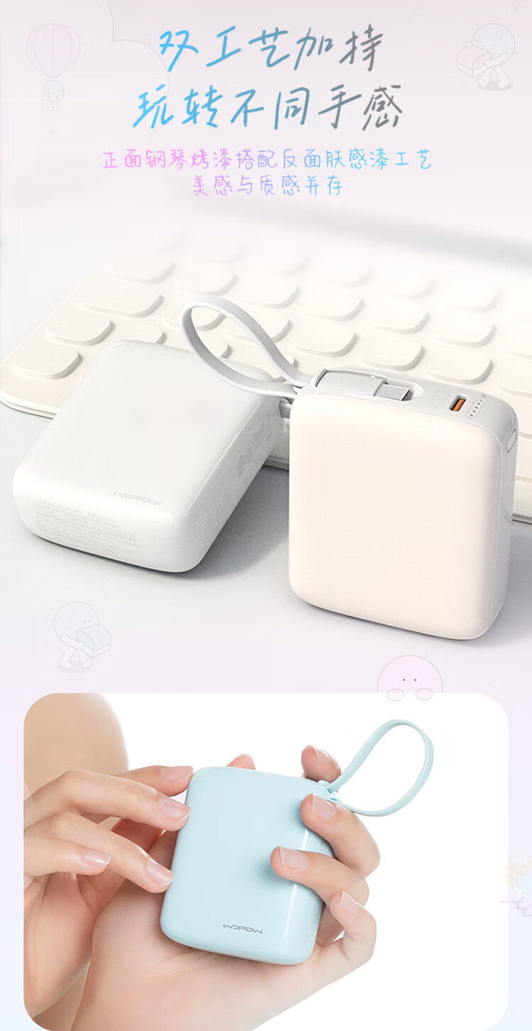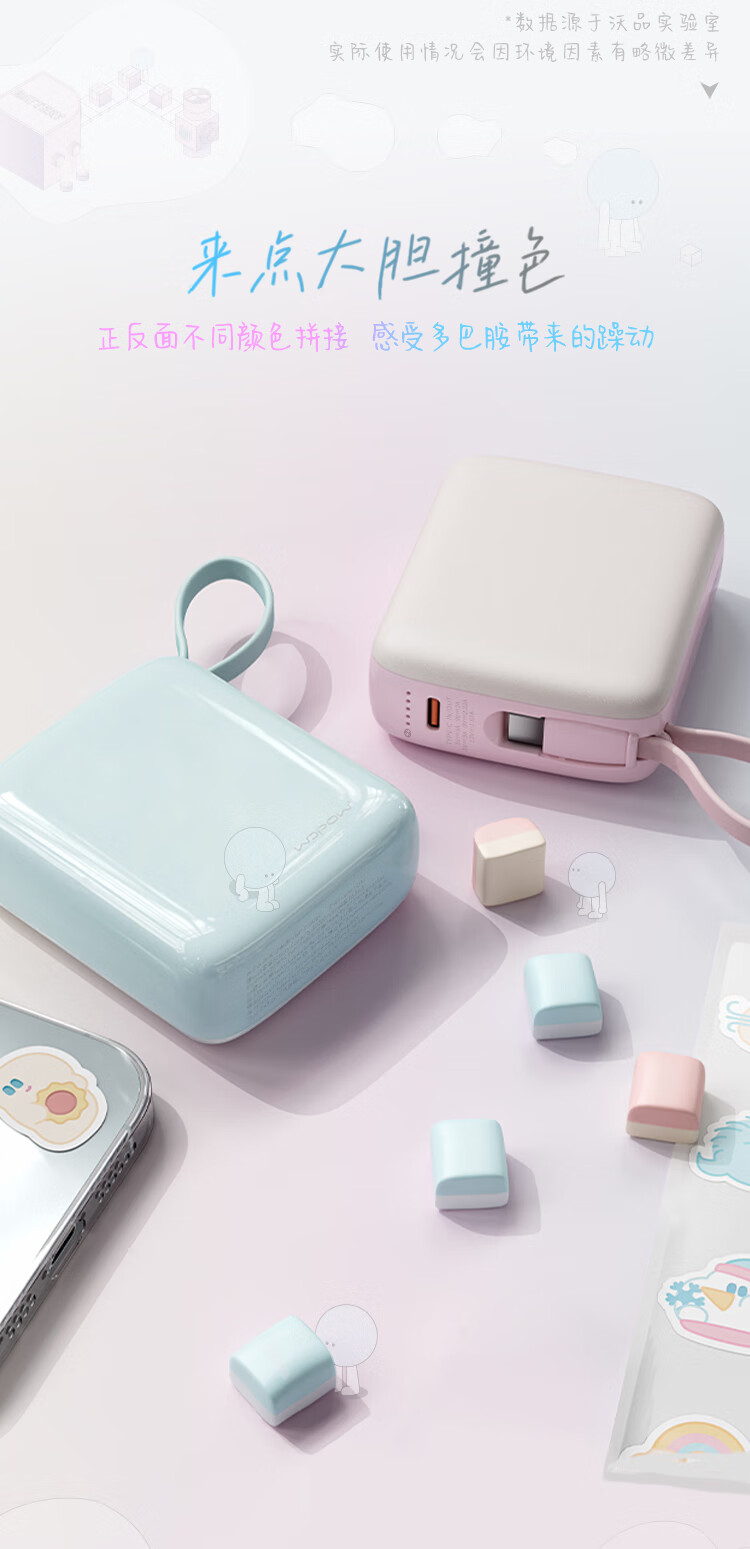 沃品(WOPOW)小方糖充电宝10000毫安 PD22.5W快充 便携小巧自带线移动电源适用于小米华为苹果15 粉色