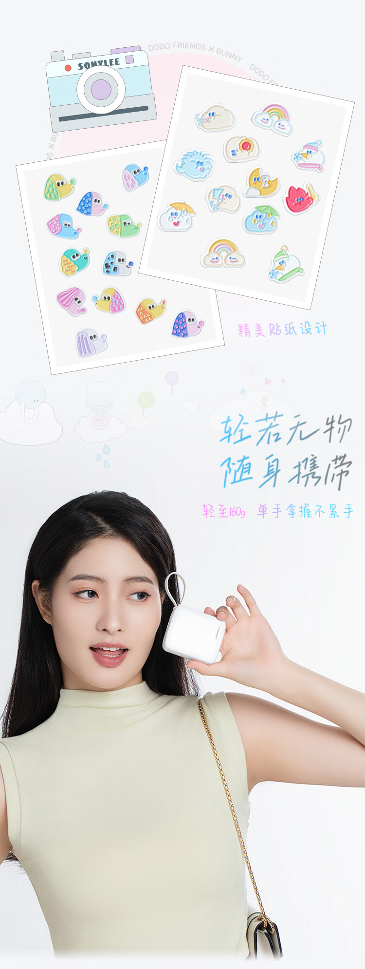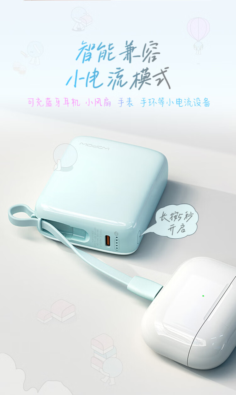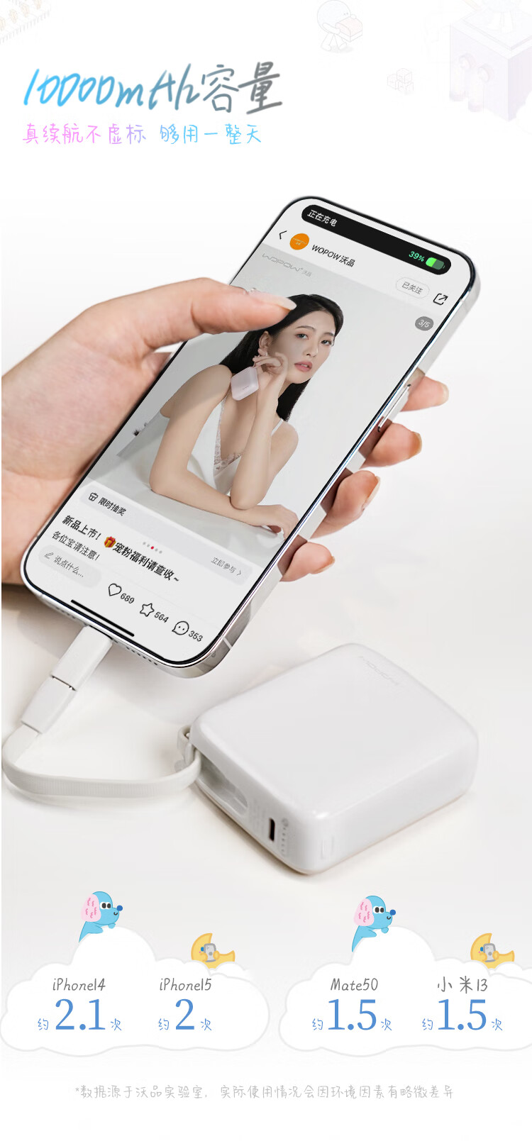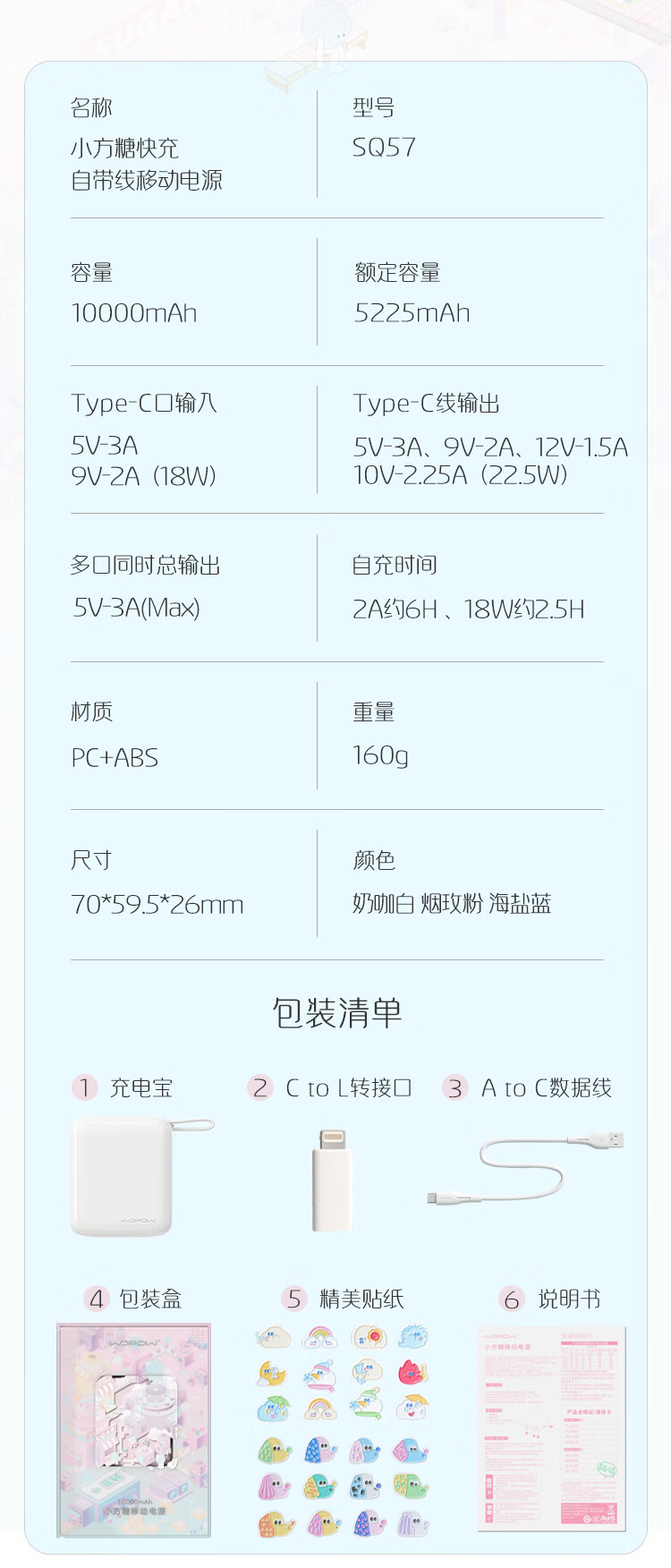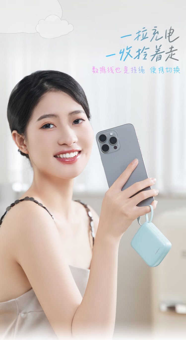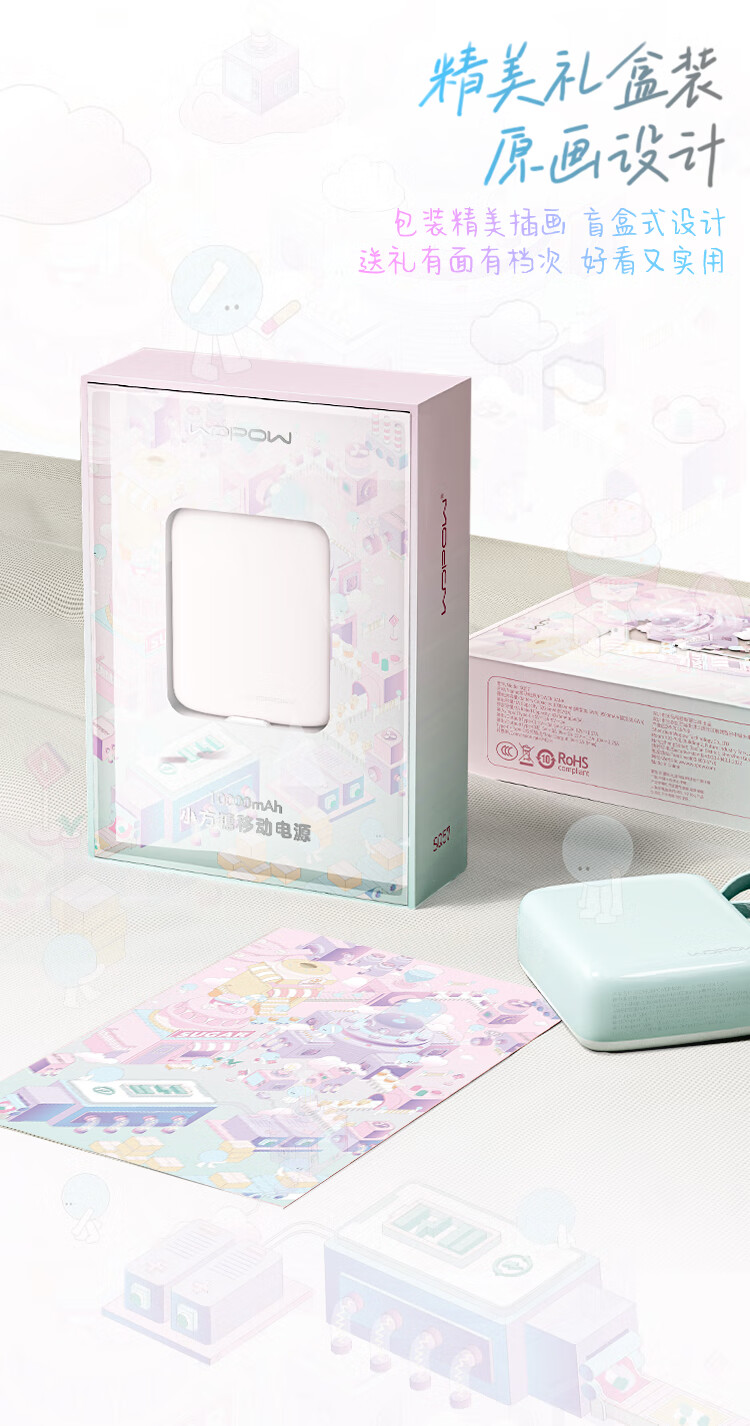 沃品(WOPOW)小方糖充电宝10000毫安 PD22.5W快充 便携小巧自带线移动电源适用于小米华为苹果15 粉色