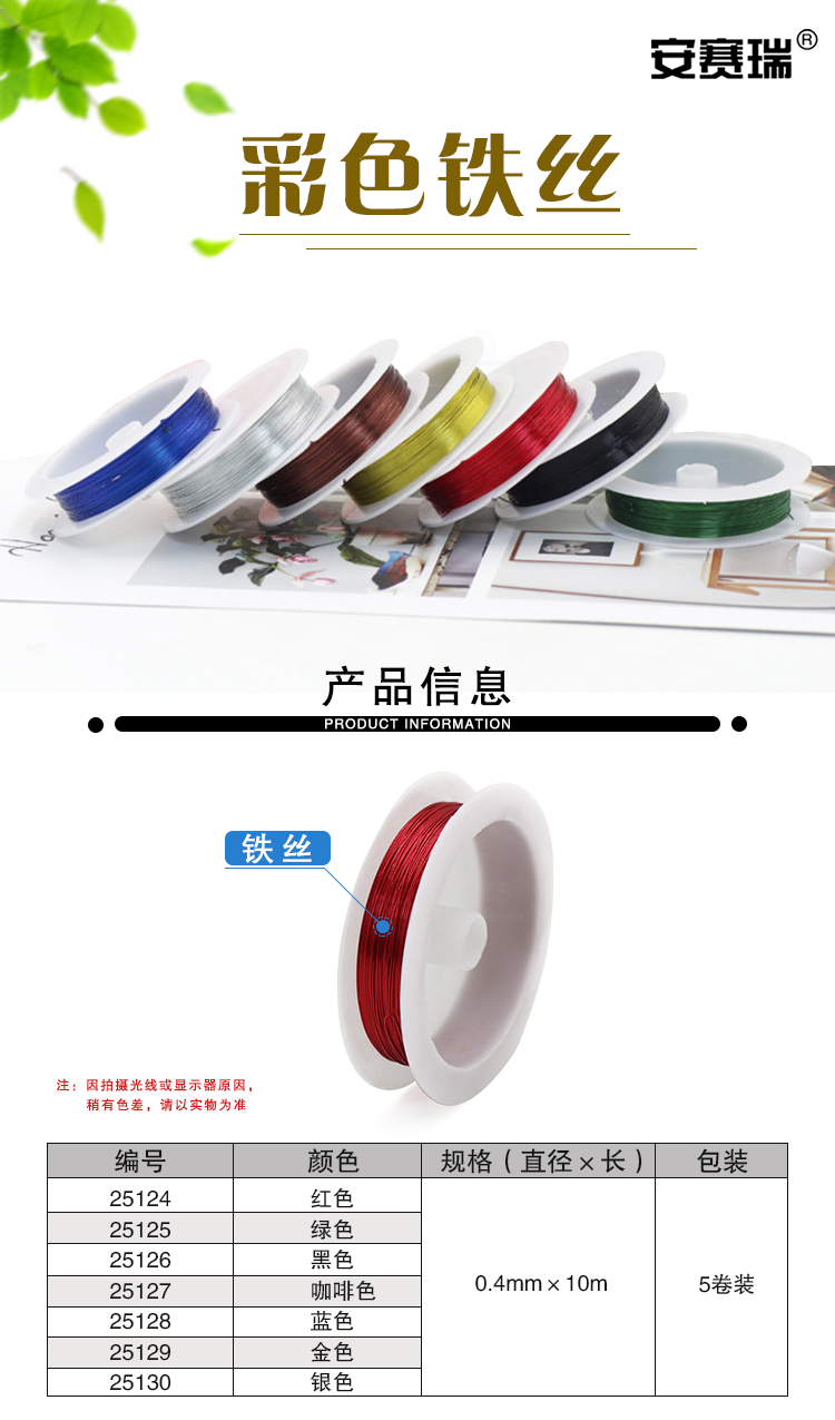 安赛瑞 彩色铁丝(5卷装)手工细软园艺扎线丝编织材料 手工课用金属丝捆扎铁丝 0.4mm×10m 黑色 25126