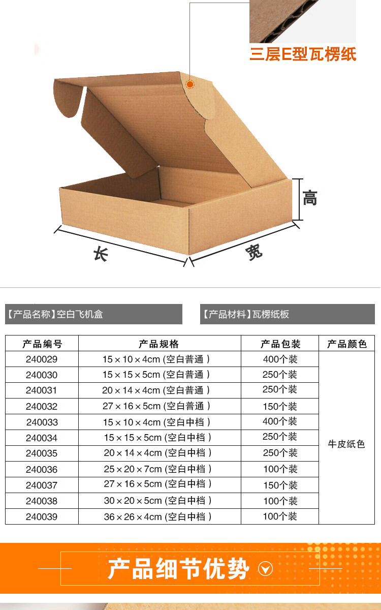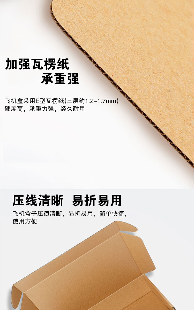 采用三层E型瓦楞纸板(厚度约1.2~1.7mm),加厚加硬,硬度高,承重力强,经久耐用