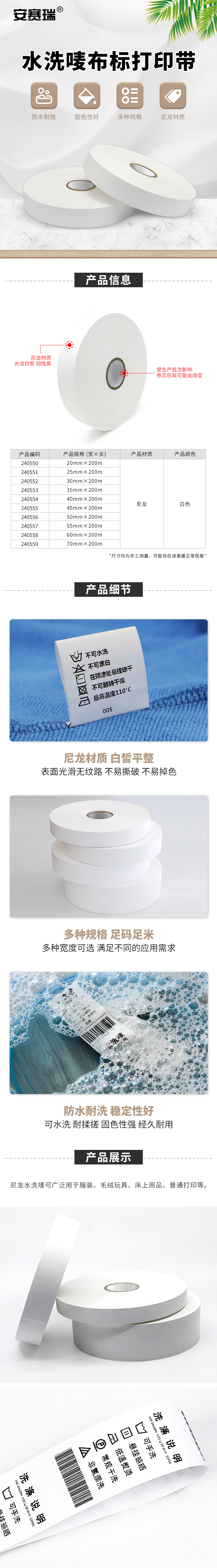 安赛瑞 水洗唛布标打印带 服装家纺缎带领标尼龙水洗标签 宽35mm长200m 配水洗碳带使用 240553