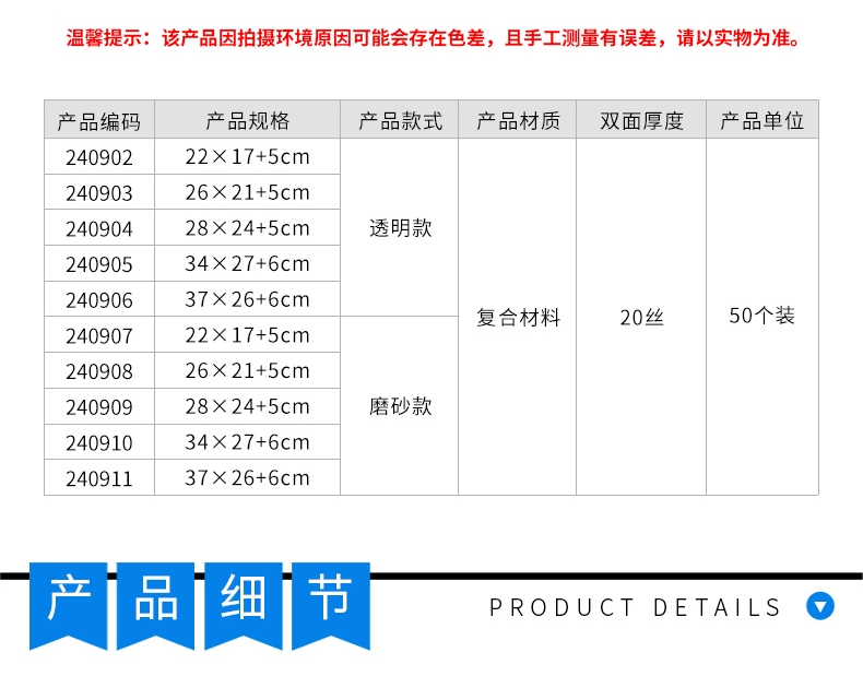 5 规格参数:型号240908为磨砂款,尺寸26×21+5cm,每包50个装