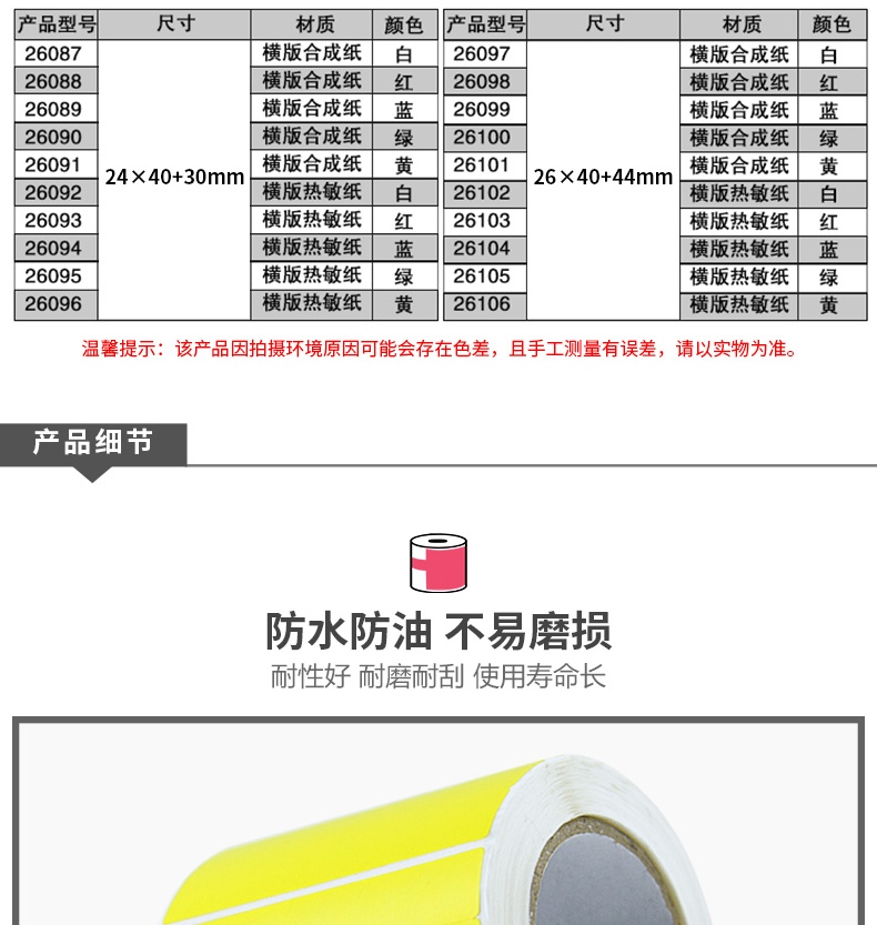 材质为横版合成纸,防水防油,耐磨耐刮,使用寿命长