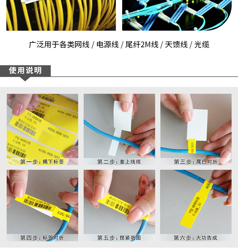 贴合线缆时请按照步骤操作:揭下标签→套上线缆→尾巴对折→标签对折→捏紧加固,确保贴合牢固