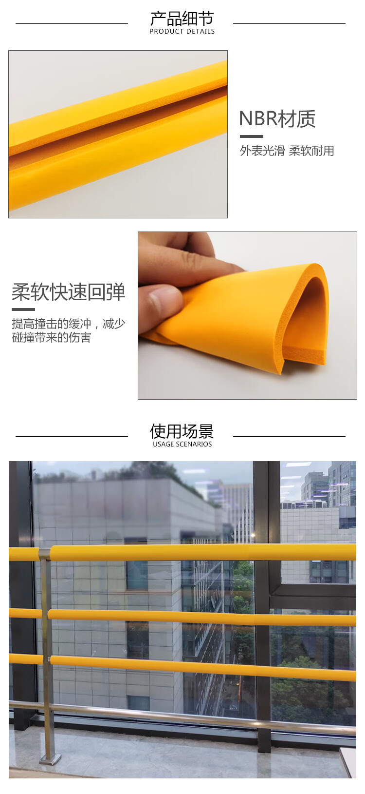 材质采用NBR(丁腈橡胶),外表光滑,柔软耐用且具有快速回弹性能,能有效缓冲撞击力,减少碰撞伤害
