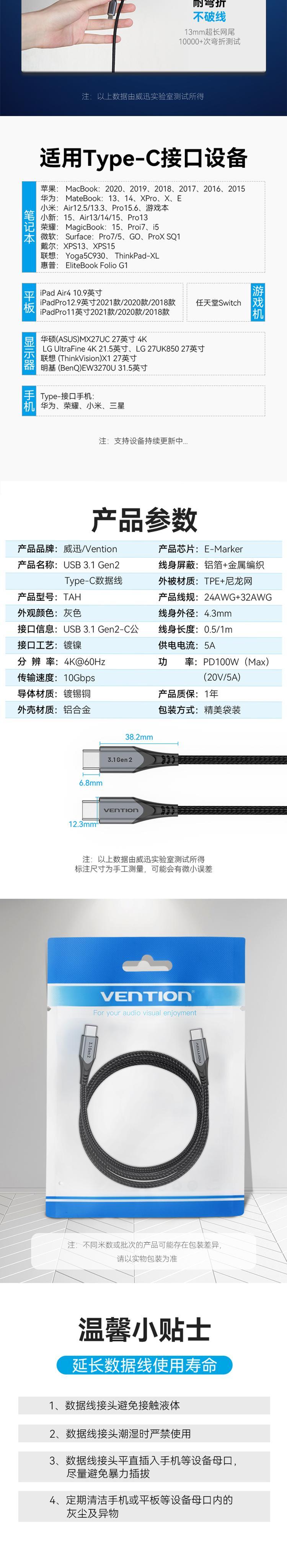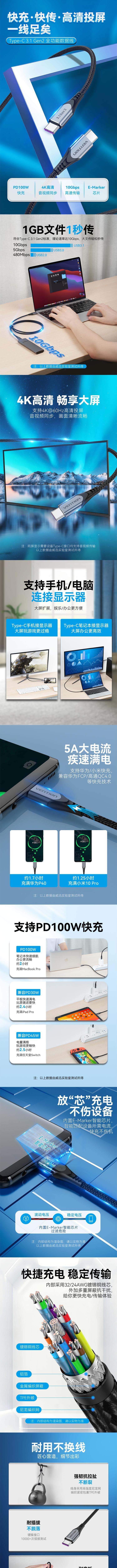 威迅TAH系列USB 3.1 Gen2 C公对C公5A数据线铝合金款灰色1米
