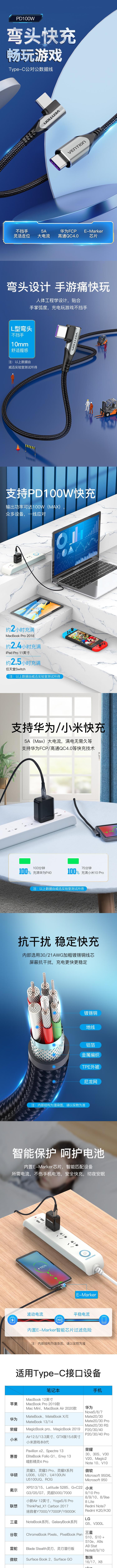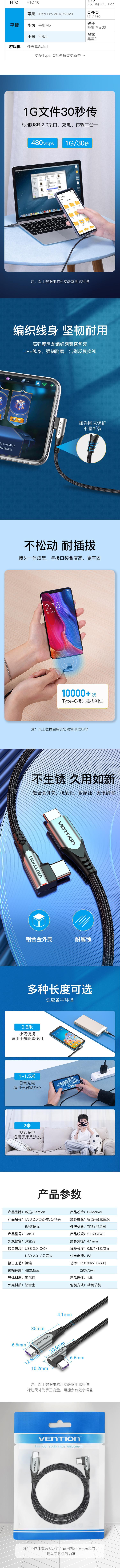 威迅TAK系列USB 2.0 C公对C公5A数据线弯头圆线铝合金款灰色2米