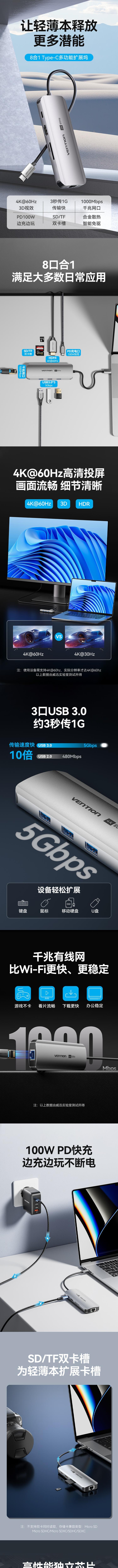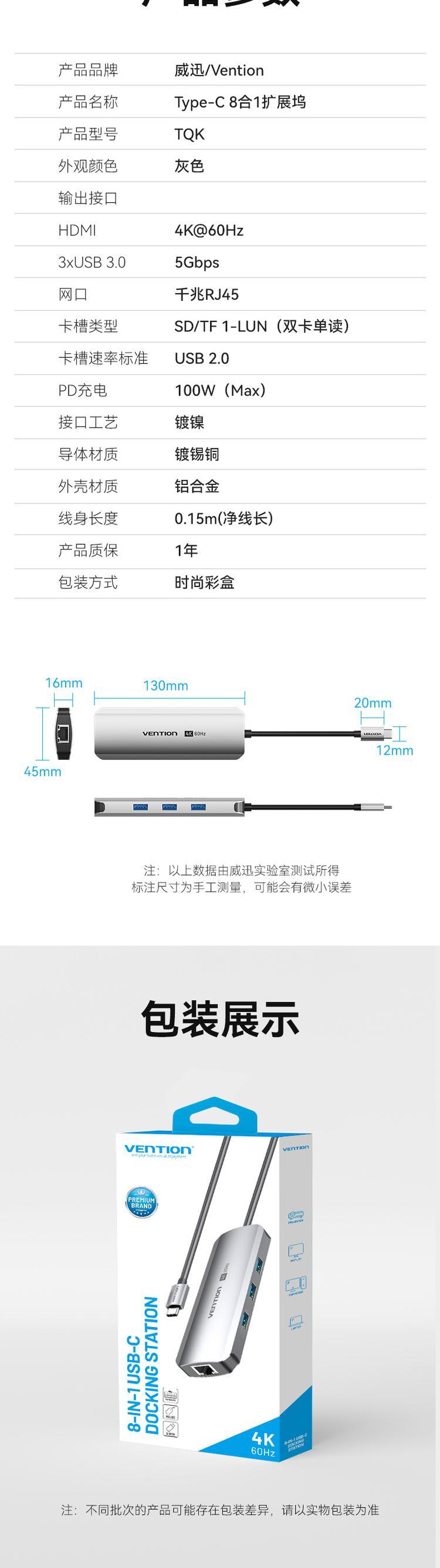 威迅TQK系列Type-C转HDMI+USB 3.0x3+RJ45+SD+TF+PD扩展坞铝合金款灰色0.15米