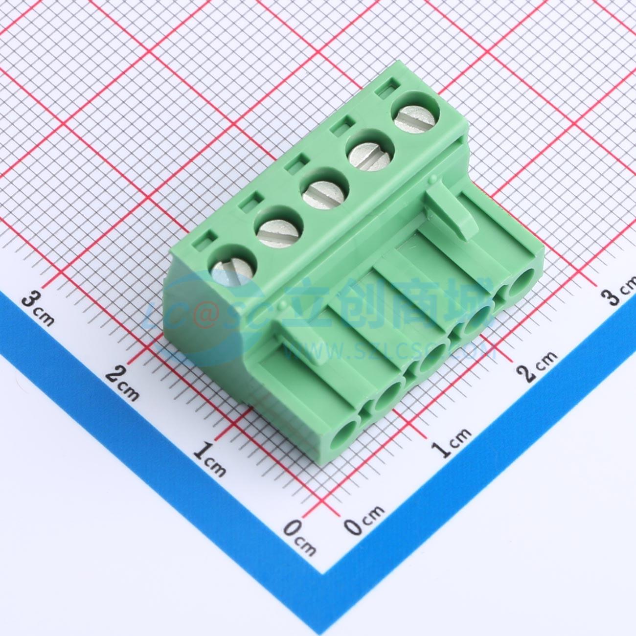 - 插拔式连接器,标称工作电流为12A,位数为5,针距为5.08mm,接线方式为带压片的螺钉连接,颜色为绿色,触点表面为锡。