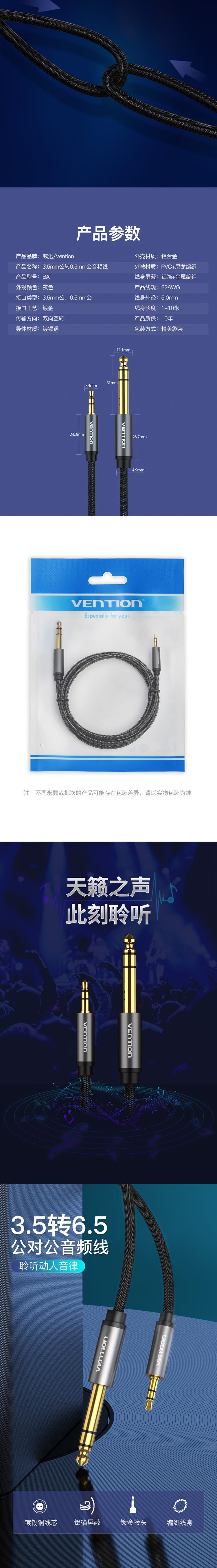 威迅BAI系列TRS 3.5mm公对6.35mm公音频线铝合金款尼龙编织灰色5米