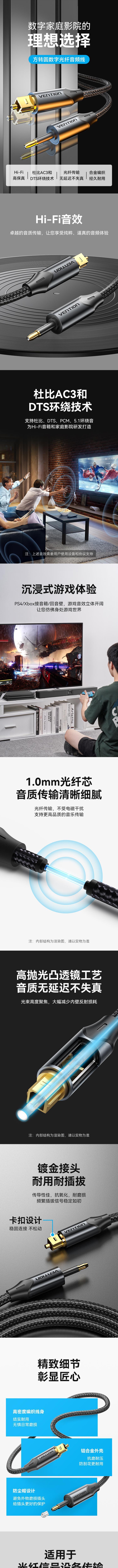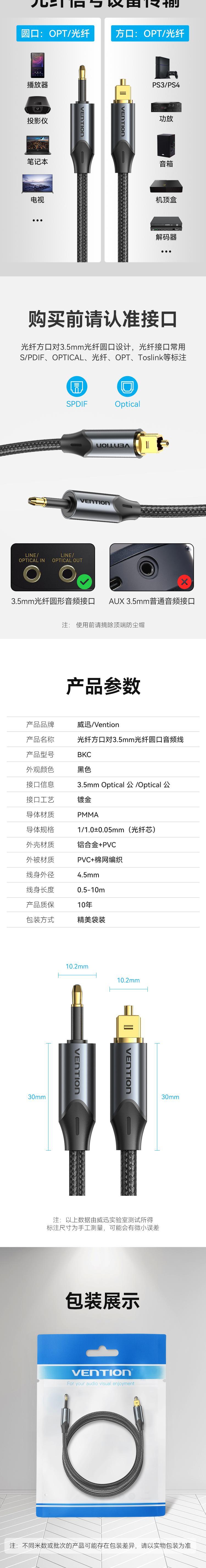 威迅BKC系列光纤方口对3.5mm光纤圆口音频线铝合金款黑色3米