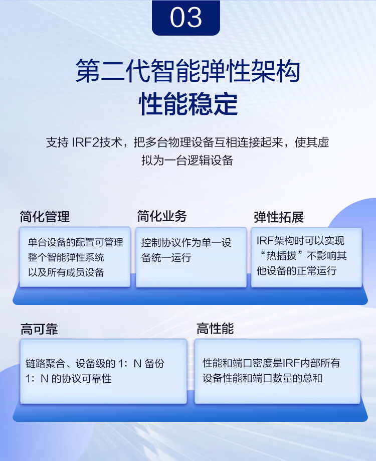 堆叠功能:支持IRF2第二代智能弹性架构,最多9台设备堆叠,实现简化管理与高可靠性