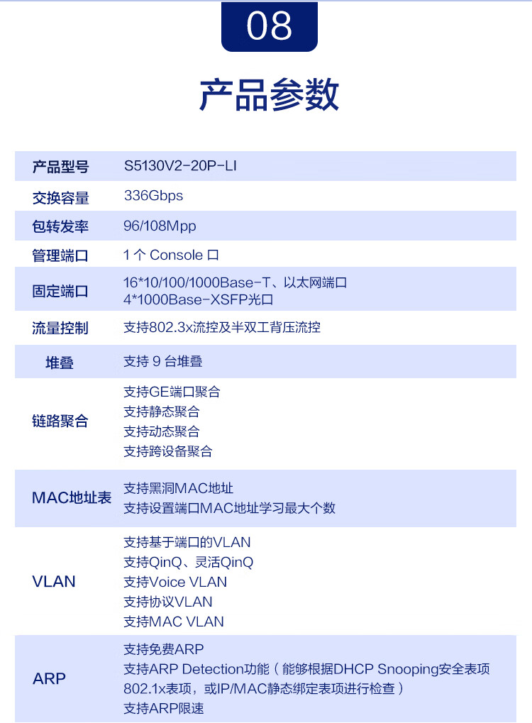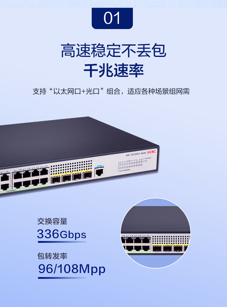 性能参数:交换容量336Gbps,包转发率96/108Mpps,支持9216 Jumbo Frame,保障高速数据传输稳定性