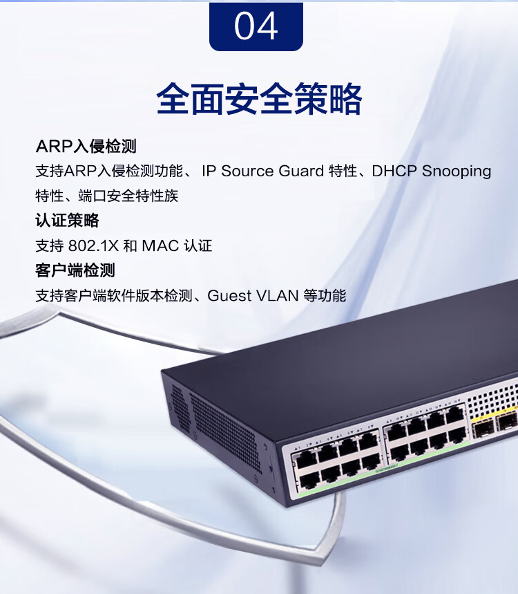 安全特性:支持ARP入侵检测、802.1X认证、MAC地址认证、IP Source Guard、EAD终端准入控制,全面防护网络安全
