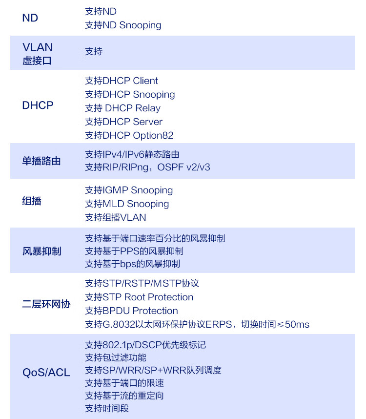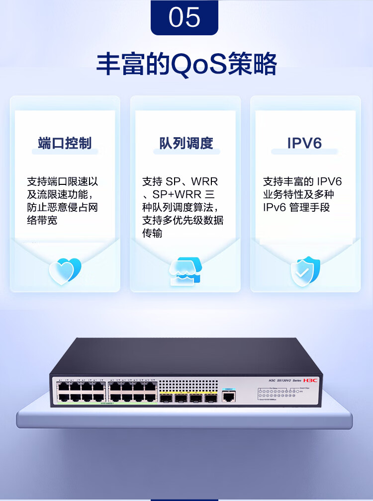 QoS策略:支持端口限速、流限速,SP/WRR/SP+WRR三种队列调度算法,保障关键业务优先传输;支持IPv6业务特性