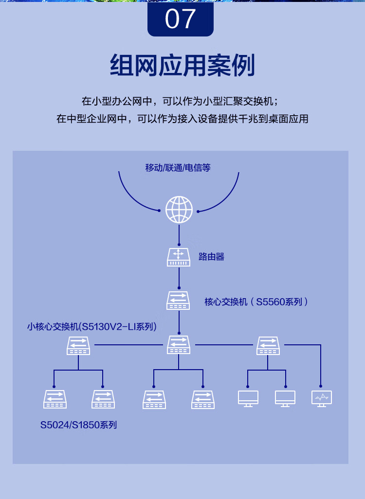 易管理性:支持CLI命令行、Web网管、Telnet、SNMPv1/v2/v3,兼容iMC智能管理中心,配置维护便捷高效