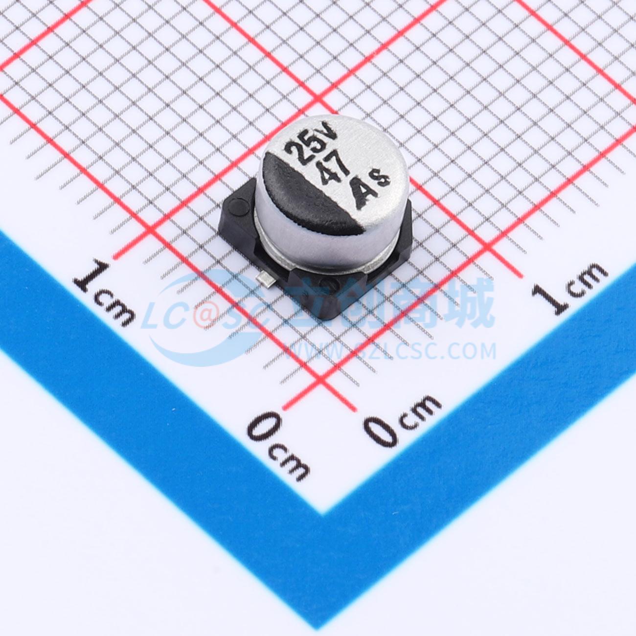 - 贴片电解电容4.5高(-55~+105度) 寿命:1000H容量:47UF电压:25V封装:SMD:D6.3xL4.5mm