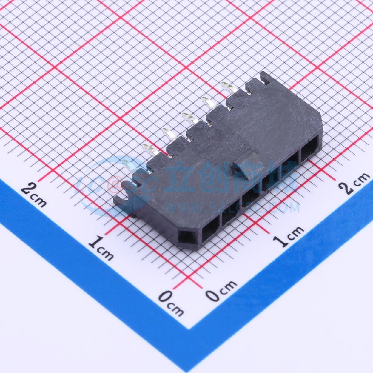- Micro-Fit 3.0垂直插头,间距3.00mm,单排,6路电路,带PCB定位销,镀锡,耐灼热丝,黑色