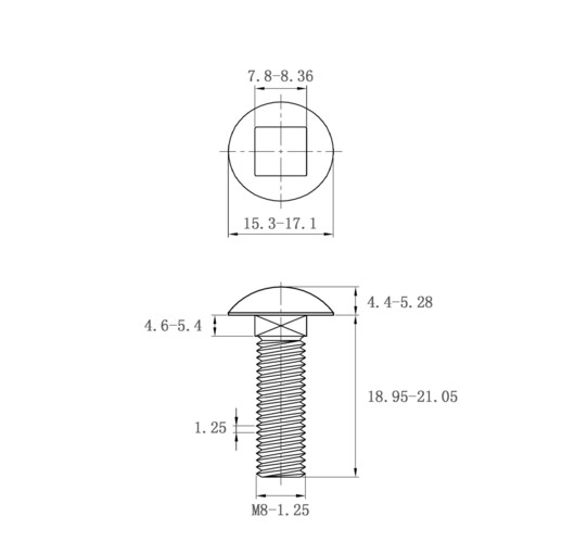该产品为FAST(法思特)品牌生产的半圆头方颈螺栓,型号GZS223039,采用304不锈钢材质,具有优异的耐腐蚀性、抗拉强度和抗氧化性能,适用于高要求的工业环境。螺栓规格为M8×20,螺纹公称直径8mm,螺距1.25mm,螺纹长度符合标准设计,确保连接稳定性。头部为半圆形设计,表面光滑,便于安装与拆卸,同时减少应力集中;方颈结构有效防止拧紧时打滑,提升操作效率。表面经过洗白处理,外观整洁,无氧化层残留,进一步增强防腐能力。尺寸精度高,符合标准,可广泛用于精密机械装配。主要尺寸参数包括:头部直径15.3-17.1mm,头部高度4.6-5.4mm,方颈边长7.8-8.36mm,总长度18.95-21.05mm,螺纹部分长度约18mm,满足多种工况下的紧固需求。
