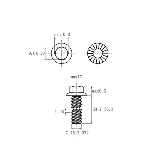 螺纹部分符合标准,螺距为1.25mm,公差等级严格控制,确保与配套螺母或螺孔的高精度配合。整体尺寸参数明确:头部直径最大17mm,法兰厚度最大8.5mm,螺杆长度范围33.7-36.3mm,螺纹外径7.76-7.972mm,满足工业装配中的精密要求。