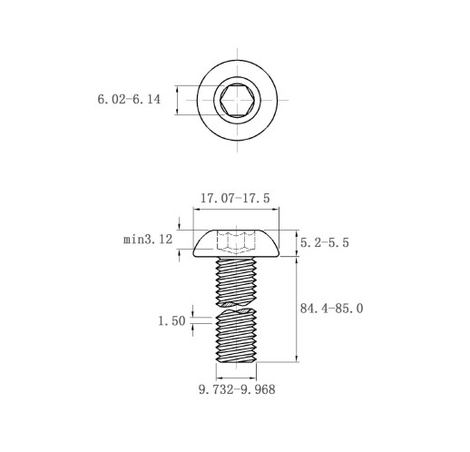 3 结构设计:内六角平圆头结构,内六角孔对边尺寸2.02 - 2.08mm,便于内六角扳手精准操作,扭矩传递稳定,有效避免滑牙;平圆头造型(头部直径5.4 - 5.7mm、头部高度1.4 - 1.65mm)安装后表面平整美观,减少突出,适配对外观要求较高的装配场景,同时降低划伤风险。