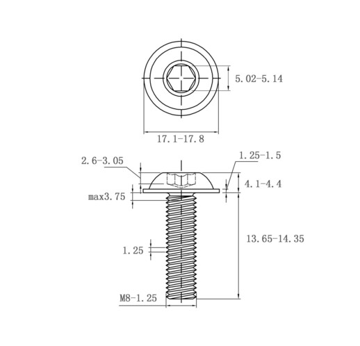 规格参数:规格为M8*14,螺纹规格为M8 - 1.25,螺纹长度13.65 - 14.35mm;头部直径17.1 - 17.8mm,内六角对边尺寸5.02 - 5.14mm,带垫厚度1.25 - 1.5mm等,尺寸精度满足机械连接的精准要求。