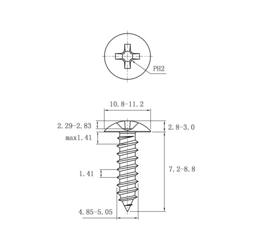 2 规格与结构:规格为ST5×8,技术图纸标注的尺寸参数(头部直径10.8 - 11.2mm、头部厚度2.29 - 2.83mm、螺纹相关尺寸等)确保精准适配;十字槽类型为PH2,适配PH2十字螺丝刀,安装便捷;大扁头设计增大支撑面,分散压力,减少安装面对损伤;自攻螺纹可直接旋入合适基材(如木材、塑料等),无需预钻孔(适配场景下),提升安装效率,螺纹牙型与尺寸保证了与基材的咬合强度。