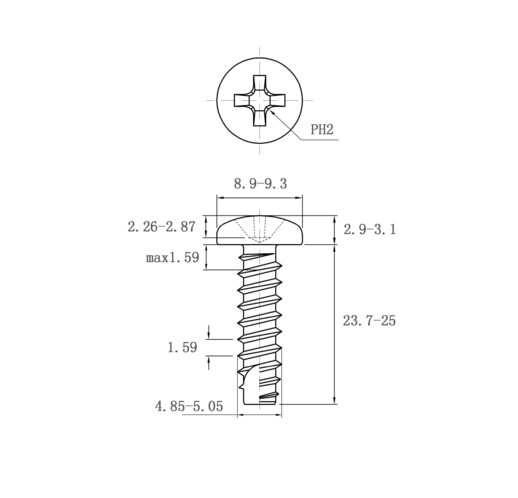 规格精准:型号GZS221531,规格为ST5*25,符合粤标标准。结合技术图纸,头部直径8.9 - 9.3mm、头部厚度2.9 - 3.1mm、螺杆长度23.7 - 25mm、割尾部分尺寸4.85 - 5.05mm,加工精度高,螺纹设计合理,自攻能力强,安装后连接稳固。