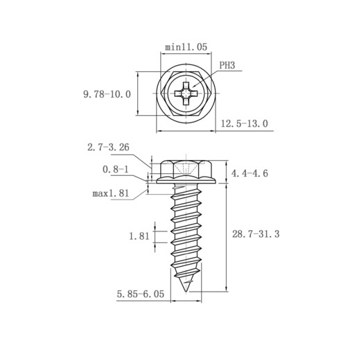 规格参数:型号212872,规格为ST6*30(自攻螺纹规格ST6,螺杆总长28.7 - 31.3mm);头部直径9.78 - 10.0mm,法兰直径12.5 - 13.0mm,螺纹起始部分直径5.85 - 6.05mm,螺纹牙高约1.81mm,尺寸精准,适配多种安装空间。