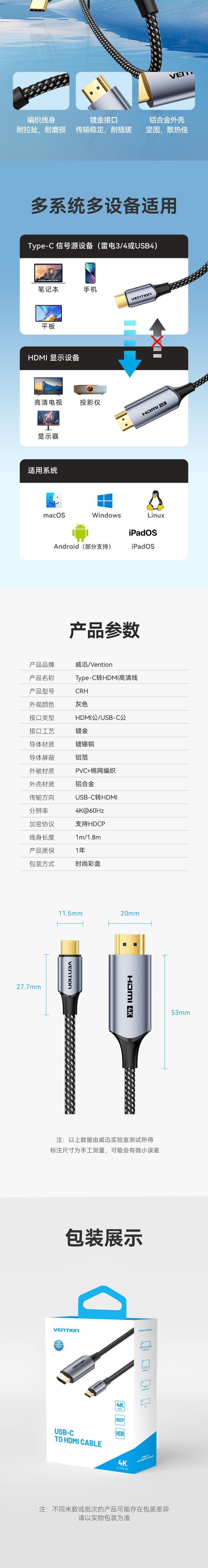 威迅CRH系列Type-C转HDMI-A 4K高清线铝合金款棉网编织灰色1.8米