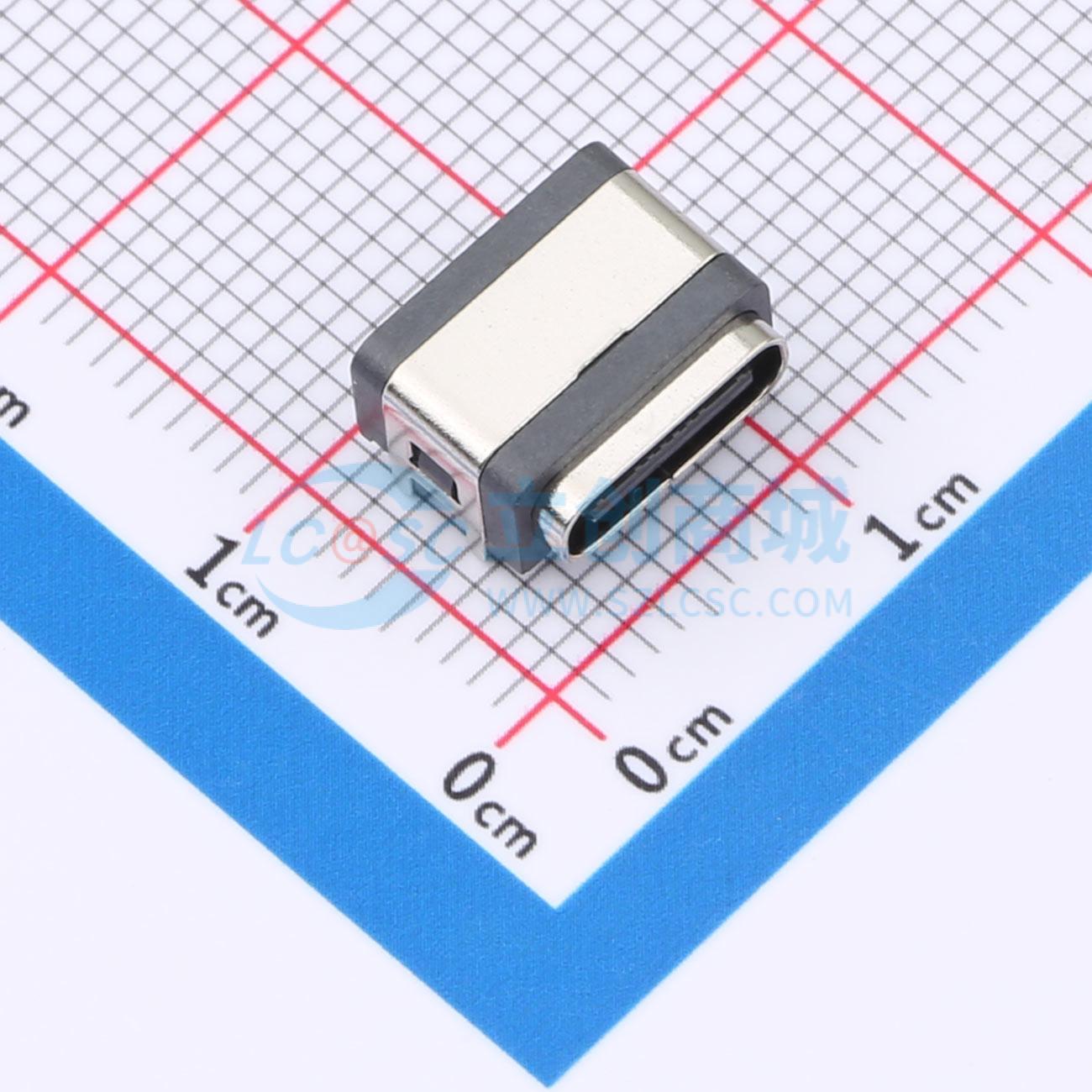 TYPE-C母座 16P 防水母座 四脚插板 板上型带塑胶柱 IPX7点胶LCP黑色 端子C2680 电镀1u 外壳 304