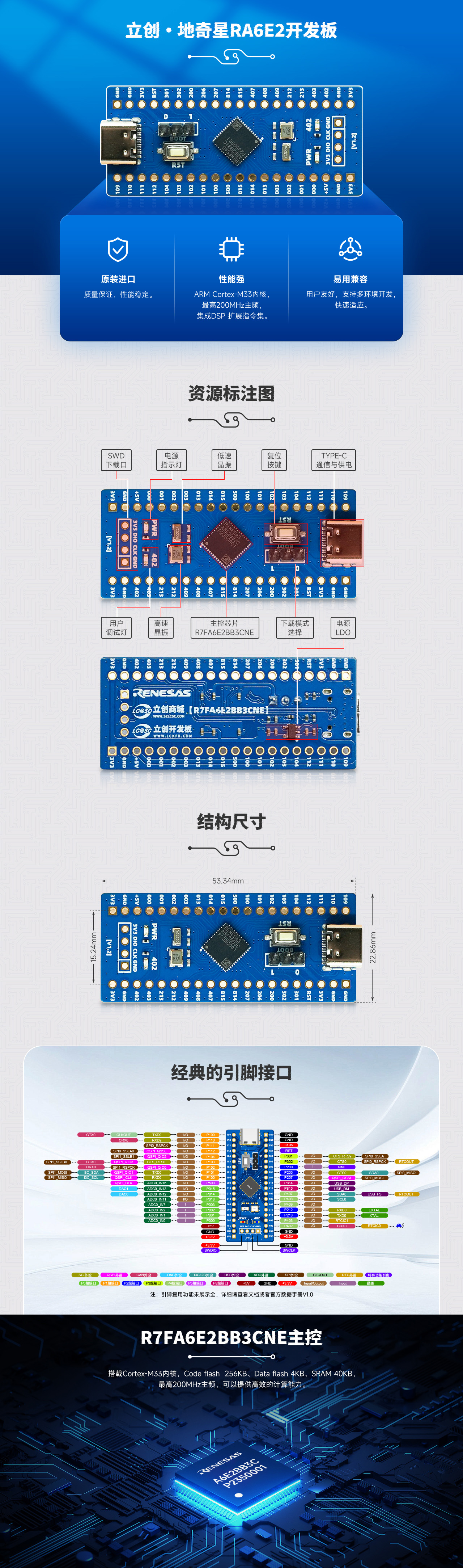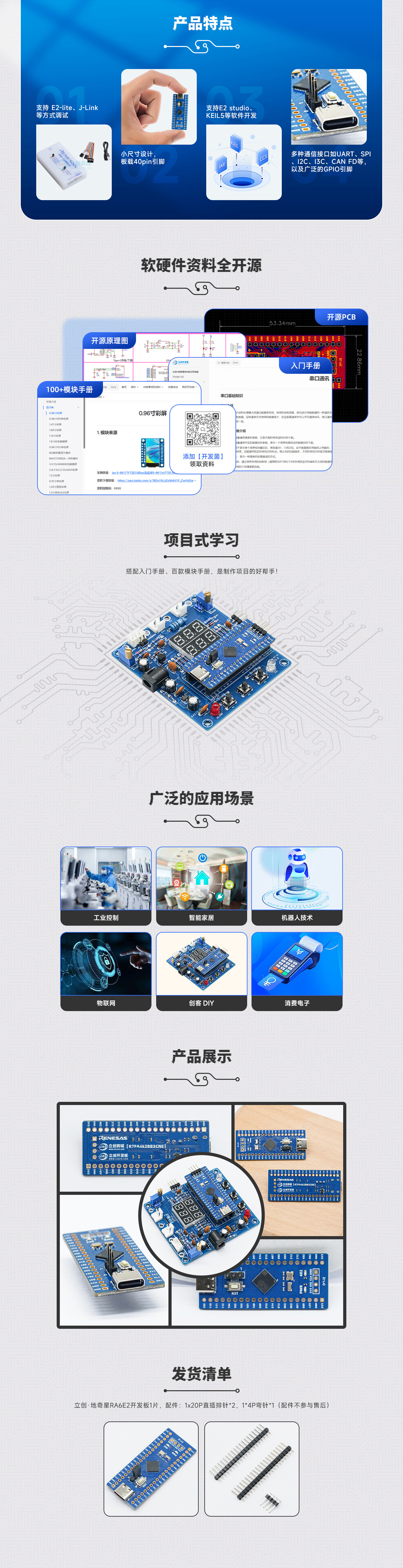- 发货清单:立创·地奇星RA6E2开发板1片,配件:1x20P直插排针*2,1*4P弯针*1(配件不参与售后)